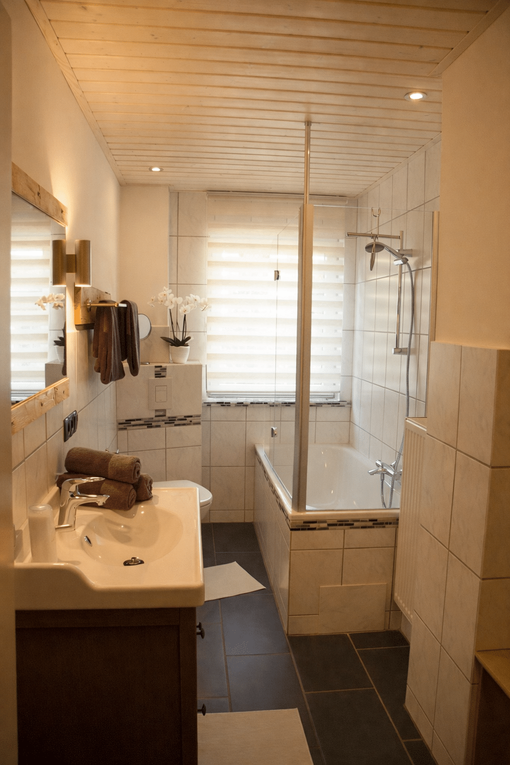 Badewanne mit stabilem Duschaufsatz, WC, extra Sitzgelegenheit, Kosmetikspiegel, großes Fenster, Föhn, Hand,- und Badetücher.