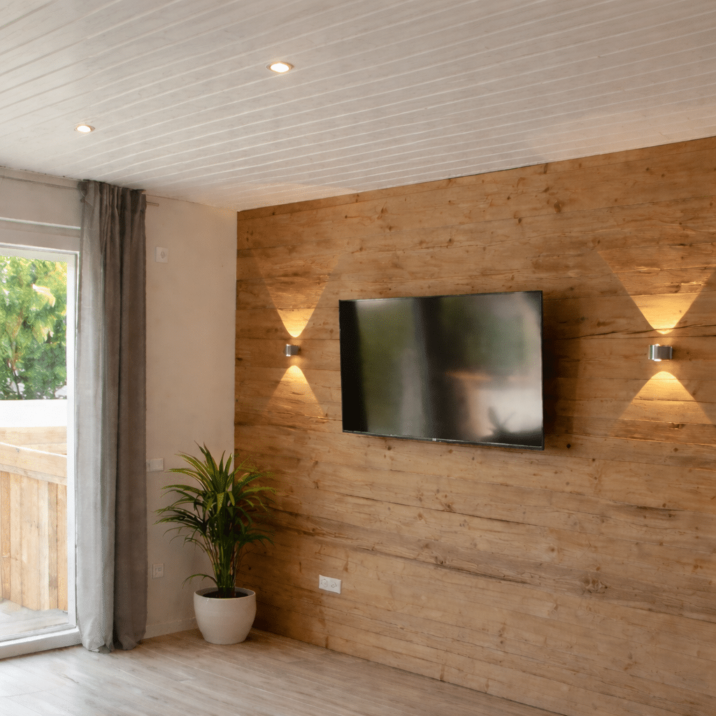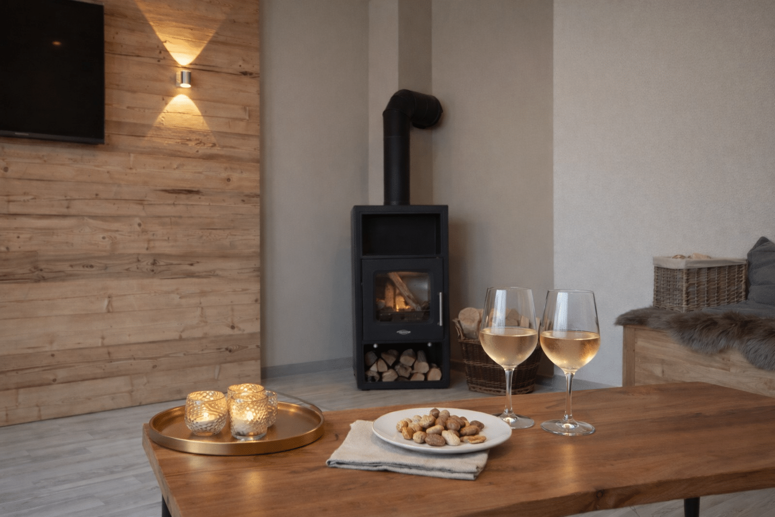 55″ Flachbildschirm, Couch, Lesestuhl, Holztruhe, elektrische Außenrollos und ein direkter Zugang zur Terrasse. In den Wintermonaten bietet der Ofen eine mollige Wärme.